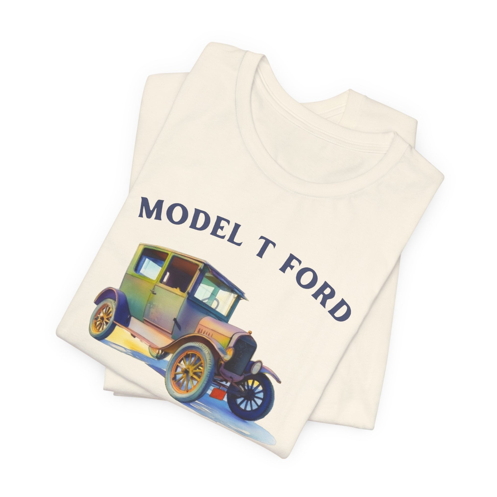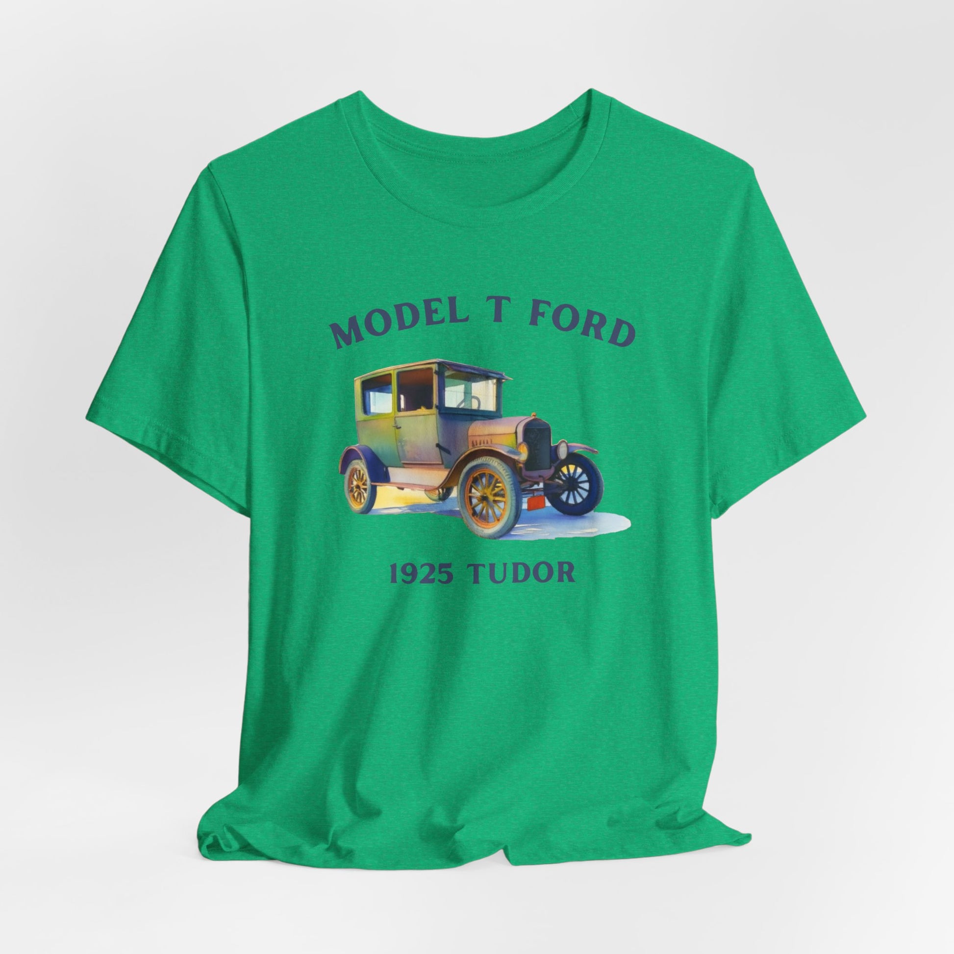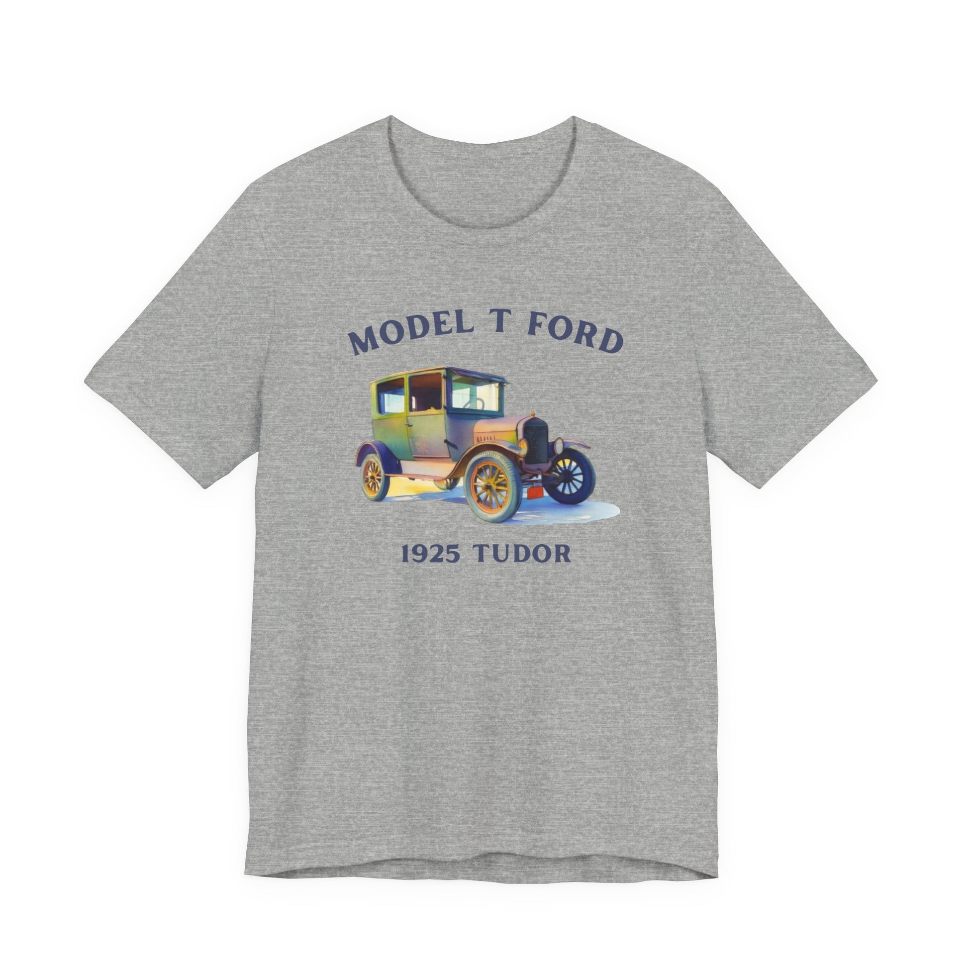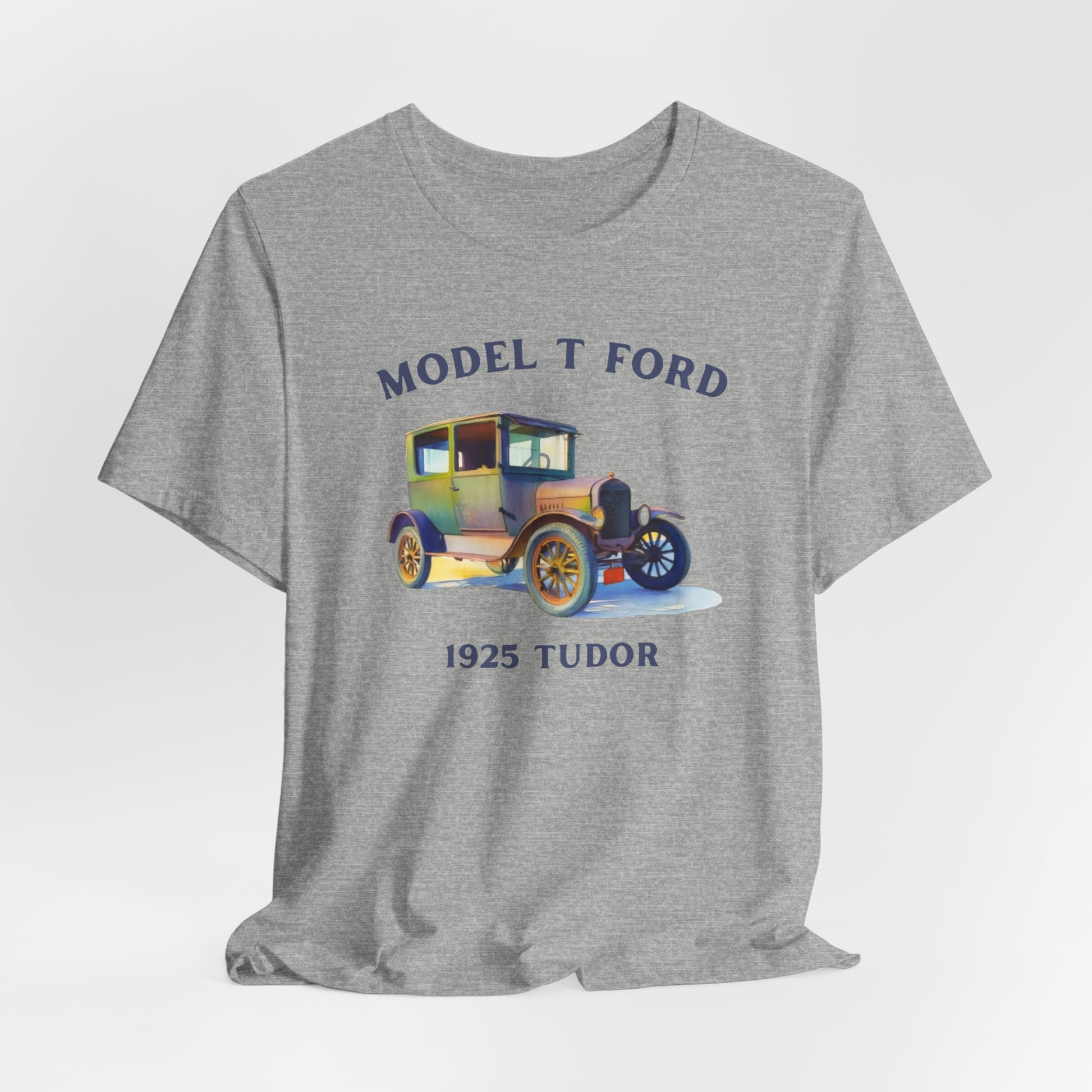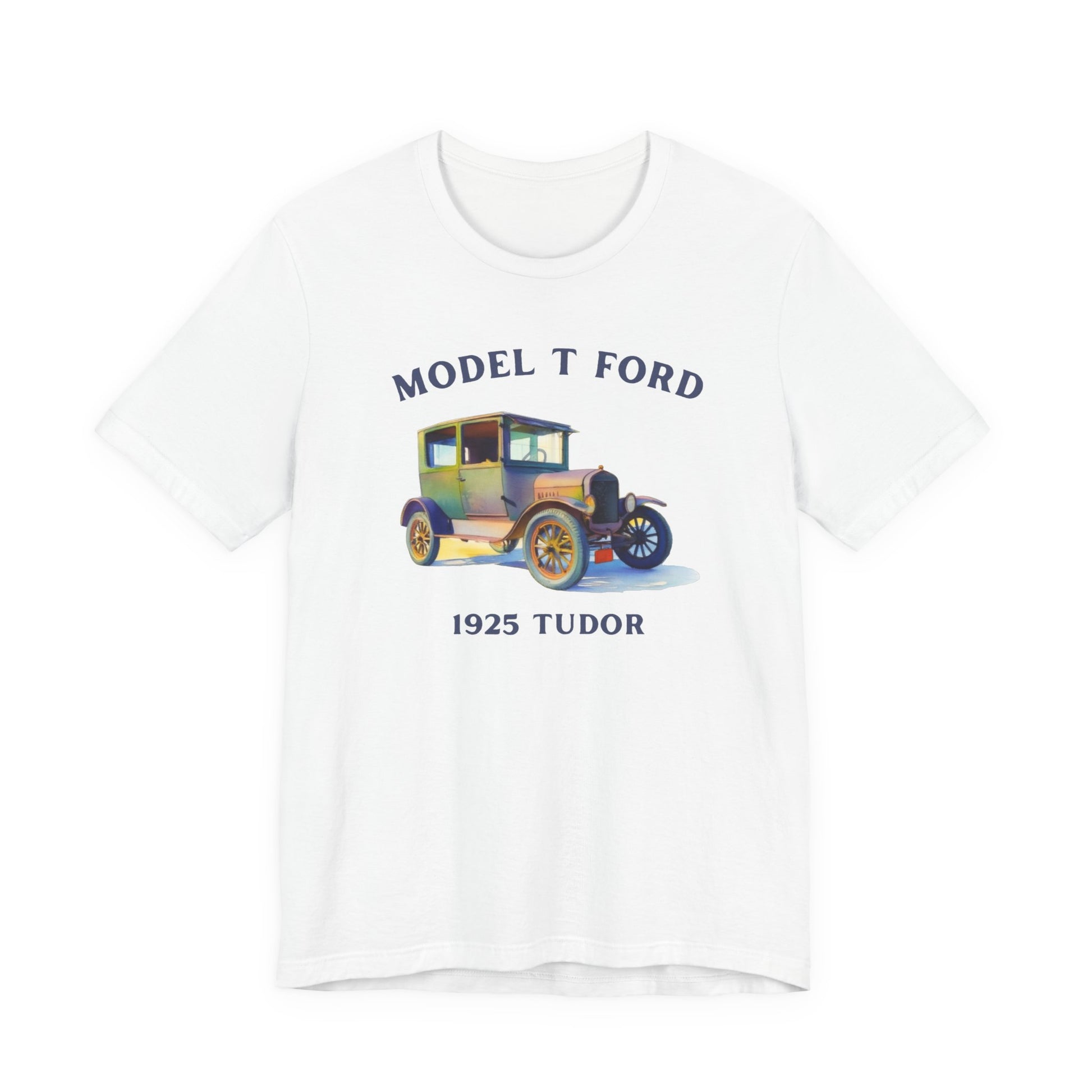This lightweight jersey tee carries a quiet vintage energy — a watercolor-style illustration of a 1925 Model T Tudor sits center chest, framed by simple, classic type. Wear it on a slow Sunday drive, to a car meet, or when you want a nod to automotive history without shouting. The soft Airlume combed cotton feels breathable against the skin, while the retail crew neckline keeps the look clean and easy to layer under a jacket or cardigan. Subtle sleeve and neck prints hold crisp detail thanks to modern DTF/DTG techniques, and the tear-away label keeps irritation away during long drives or warm afternoons.