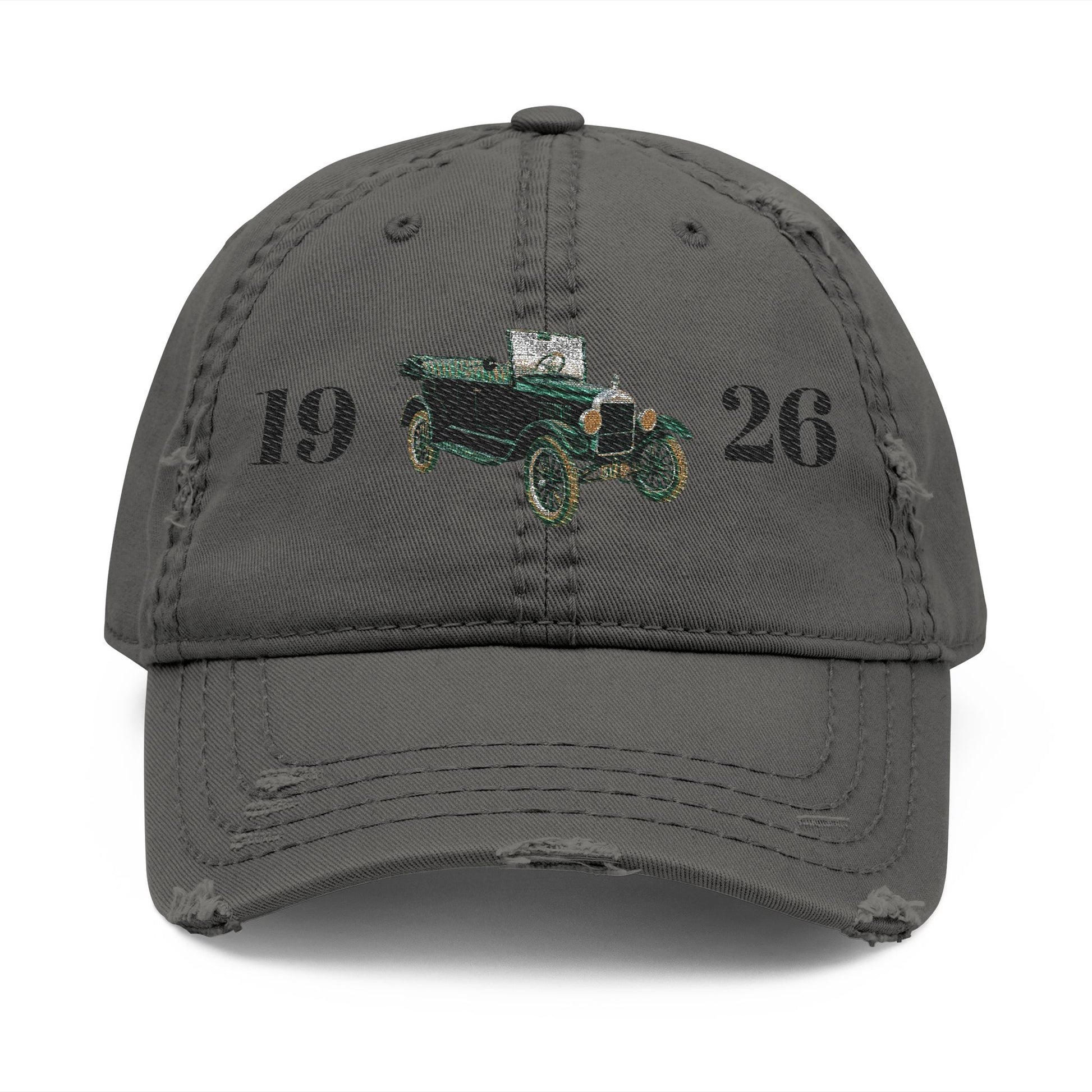 A worn-in, embroidered cotton cap that carries a quiet vintage story. Soft, low-profile crown and distressed edges give it that easy, lived-in look—like something pulled from a road-trip trunk after a long summer. The tiny embroidered 1926 car on the front nods to classic motoring and nostalgia without shouting; the muted charcoal canvas keeps it versatile and subtly rugged. The adjustable hook-and-loop strap and breathable stitched eyelets mean it’s comfortable on long drives, weekend errands, or casual afternoons spent at garage sales and car shows. It settles naturally on the head and ages gracefully, collecting memories with each wear.