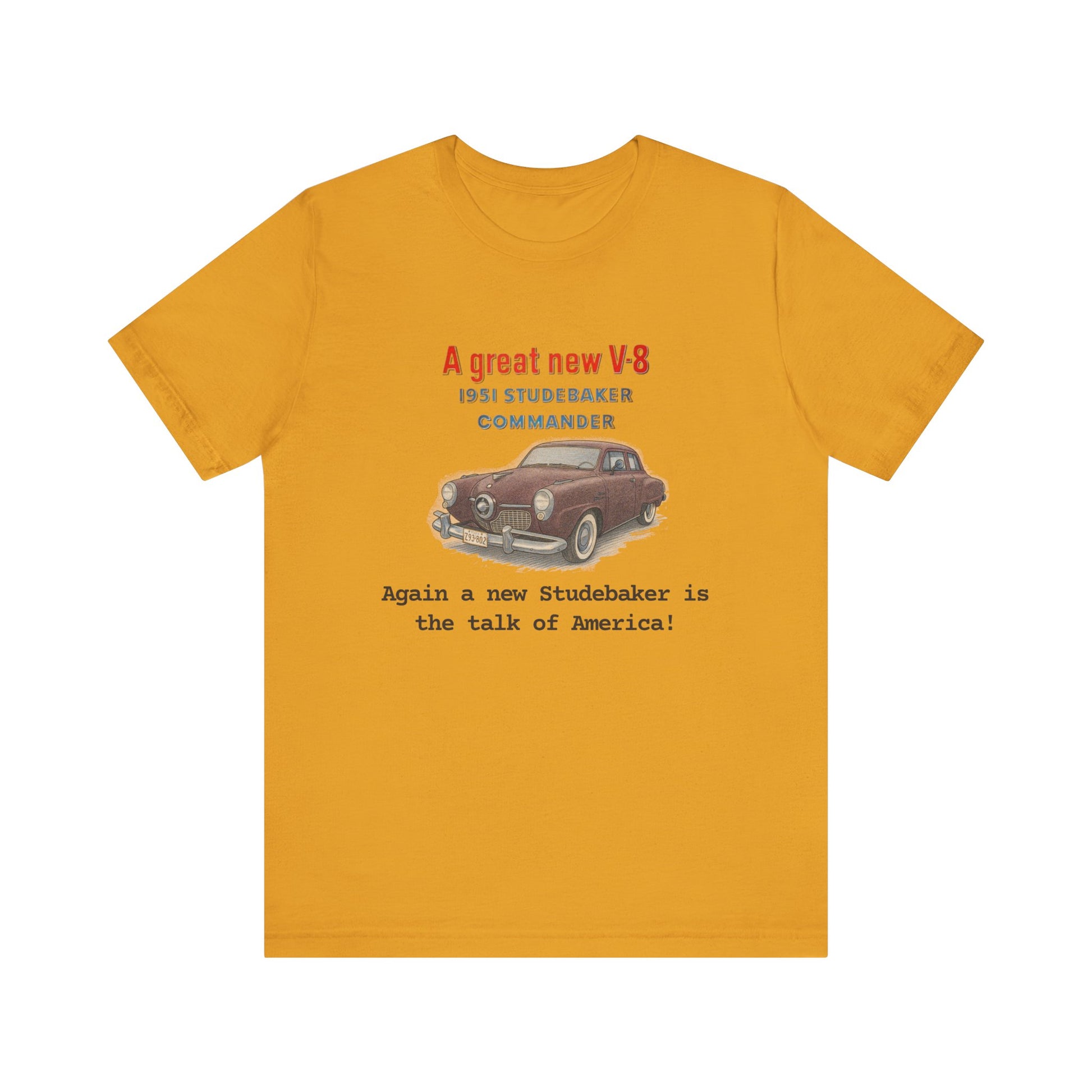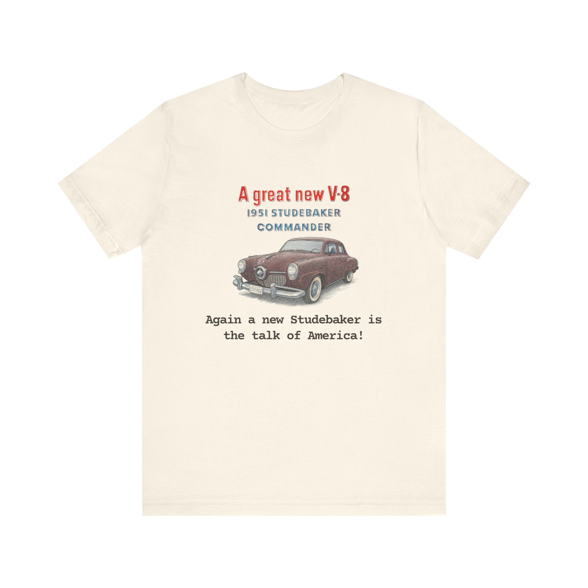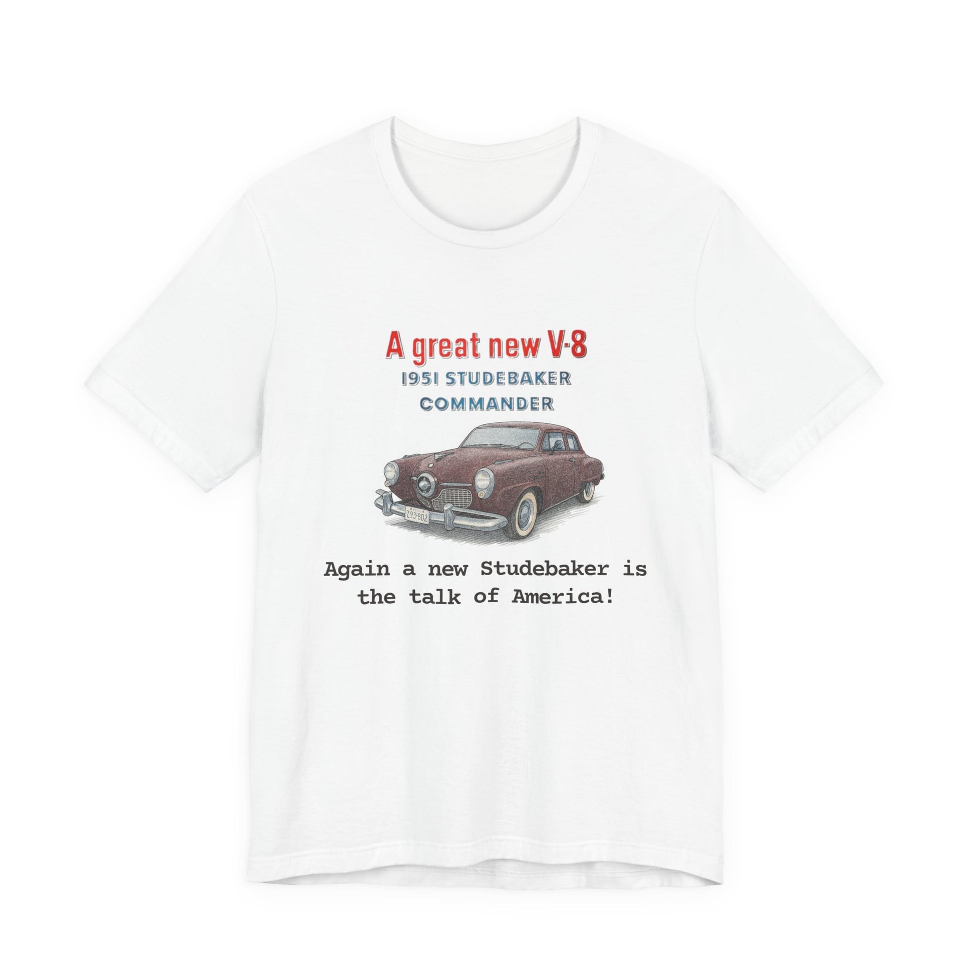1951 Studebaker Commander Vintage Car T-Shirt – 'A Great New V-8' Retro Automotive Tee