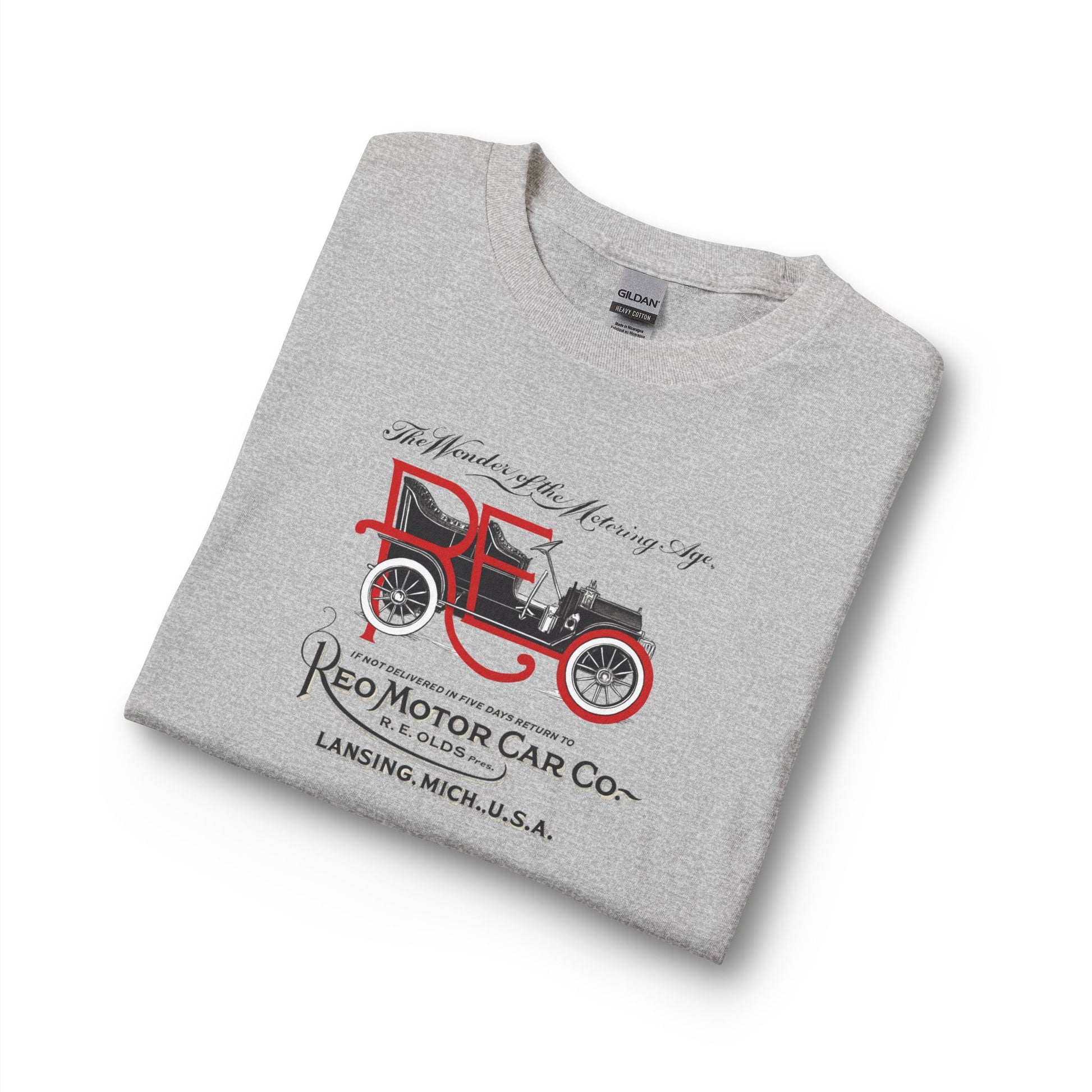 Pull on this long-sleeve and step into a quiet, sunlit afternoon at the old garage—dust motes drifting, engine tin and leather scenting the air. The shirt’s front shows a vintage Reo Motor Car illustration in muted red and black, the sort of art that sparks stories about road trips, restorations, and grandfather’s anecdotes. Lightweight but substantial 100% cotton keeps the fit relaxed and honest. Wear it while you tinker on a project, wander a weekend car show, or settle in with a coffee and a photo album of bygone rides. It feels lived-in from the first moment and holds its character wash after wash.
